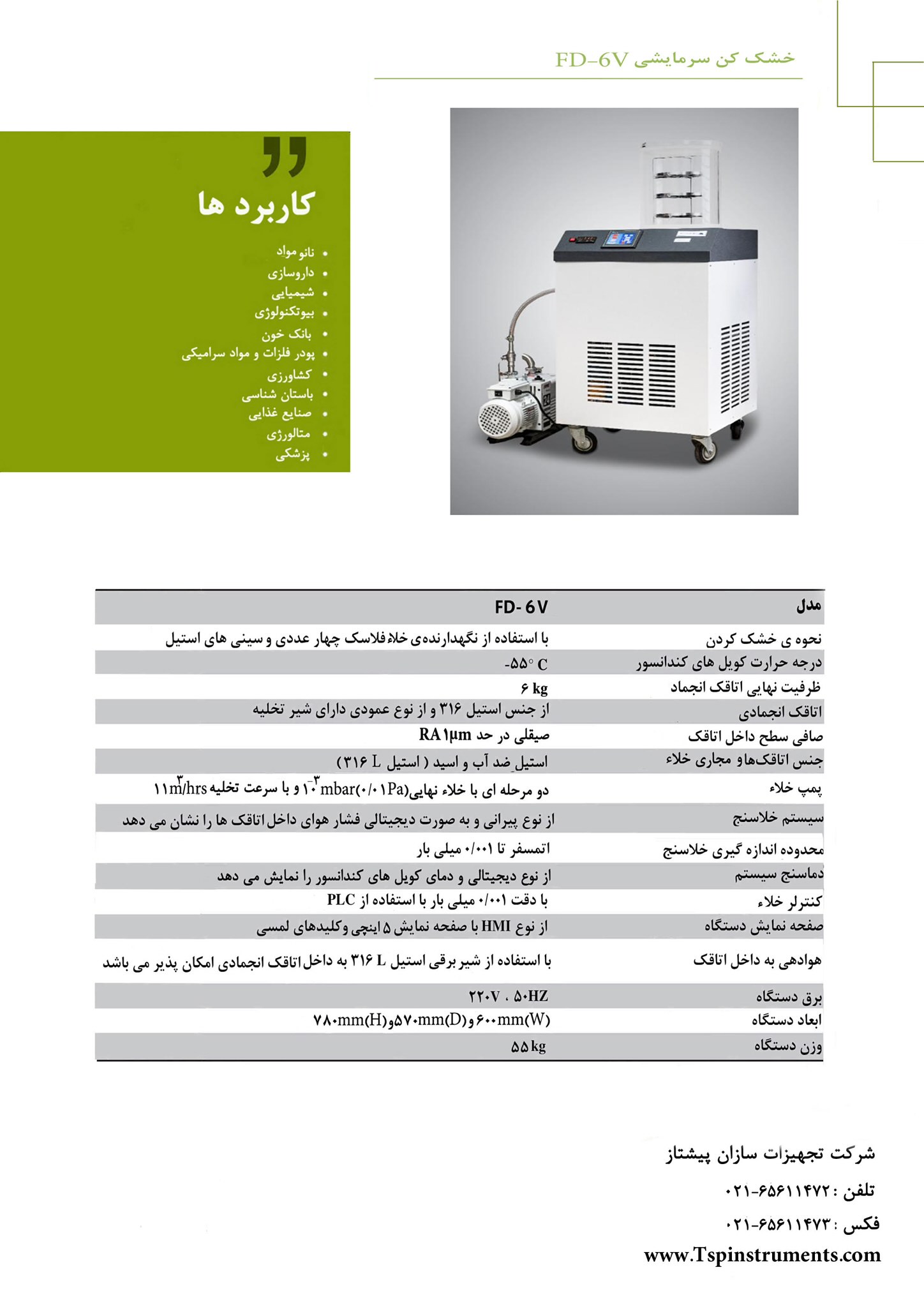 خشککن انجمادی مدل FD-6V محصولی پیشرفته از شرکت تجهیزات سازان پیشتاز است که برای فرآیند خشککردن در دمای پایین با استفاده از خلا طراحی شده است. این دستگاه برای کاربردهای متنوعی از جمله داروسازی، بیوتکنولوژی، صنایع غذایی و پزشکی طراحی شده و با تکنولوژی پیشرفته، نیازهای کاربران را به بهترین شکل برآورده میکند.
